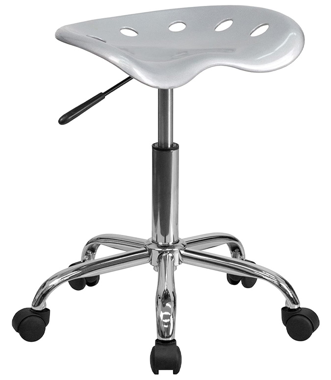 •Ruedas dobles; ajuste de altura del asiento con sistema neumático; taburete tipo tractor; largo de 15 pulgadas; ancho de 17 pulgadas; requiere montaje; acabado chapado en cromo; material plástico; altura 20.25 – 25.75 pulgadas.