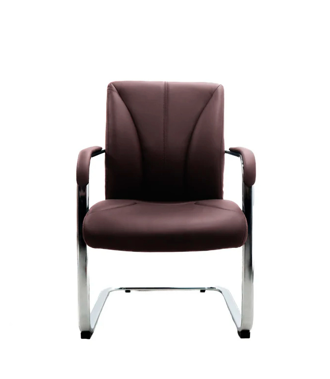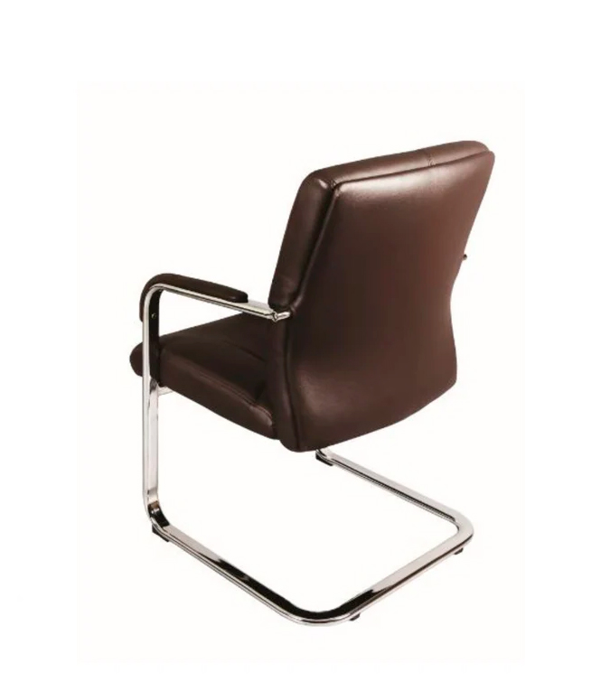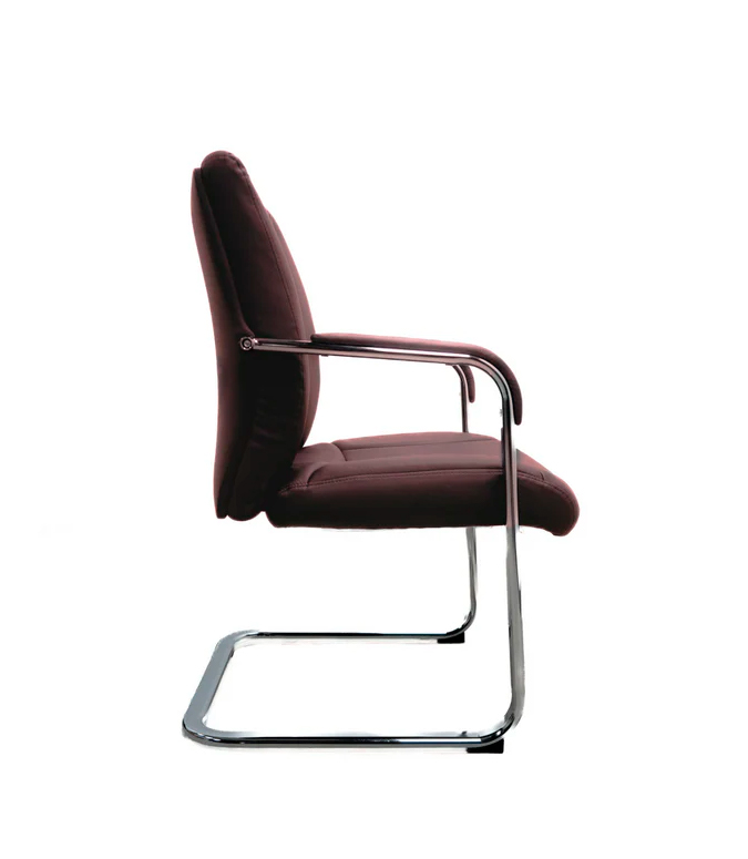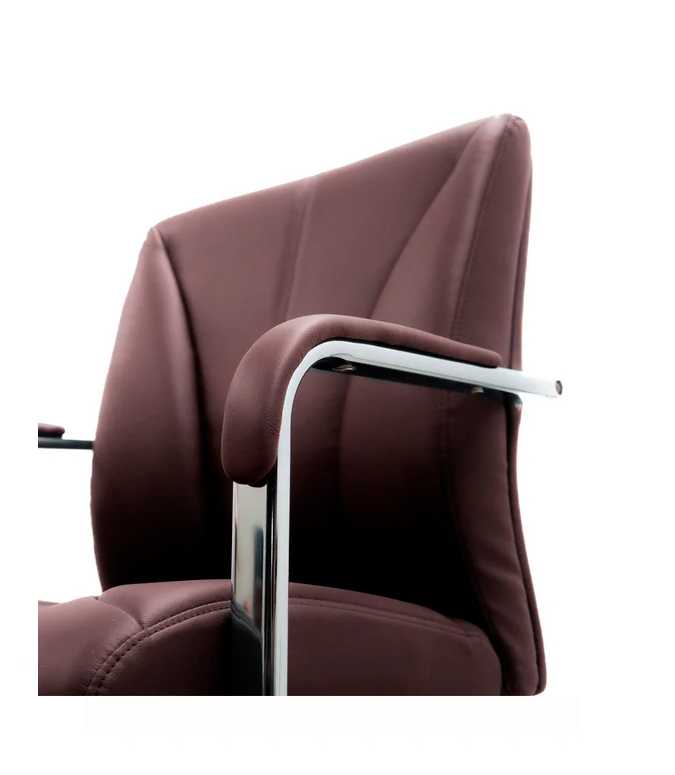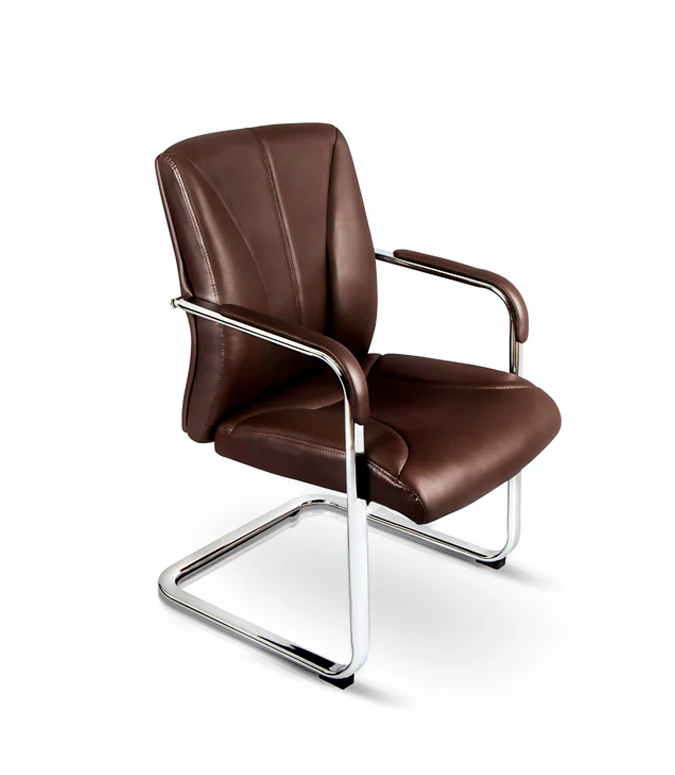 Silla de Visita respaldo de estructura de madera con diseño ergonómico, con espuma estándar de 6 cm de de espesor y 45kg/m3 de densidad, tapiz frente de piel vacuno de alta calidad y parte trasera en vinil, asiento con espuma estándar tapizado con piel vacuno de alta calidad, patín de tubo oval cromado de alta calidad con espesor de 2 mm, brazos fijos de metal cromado sujetos al asiento y al respaldo con coderas tapizadas en vinil.